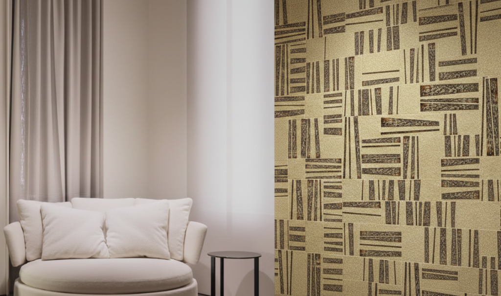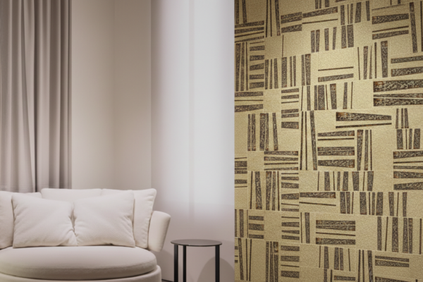 Das gewagte und raffinierte Design verleiht dem Raum Wärme und Tiefe und schafft eine ruhige und zeitlose Atmosphäre. Die Grafik ist subtil und harmonisch, mit zarten Variationen, die die Authentizität des natürlichen Materials ohne Künstlichkeit hervorheben. Und seine Oberfläche hält ein präzises Gleichgewicht zwischen Textur und Kontinuität, sodass das Licht sanft gleiten und das Material hervorheben kann.