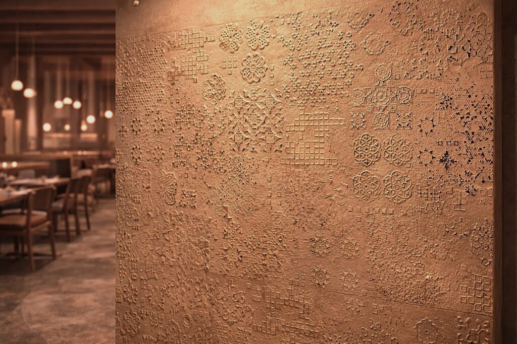 Its composition consists of different reliefs carefully designed to create vibrant and sophisticated surfaces. Light falls on the textures, creating subtle and changing shadow effects, adding depth, rhythm, and a unique sensory perception.